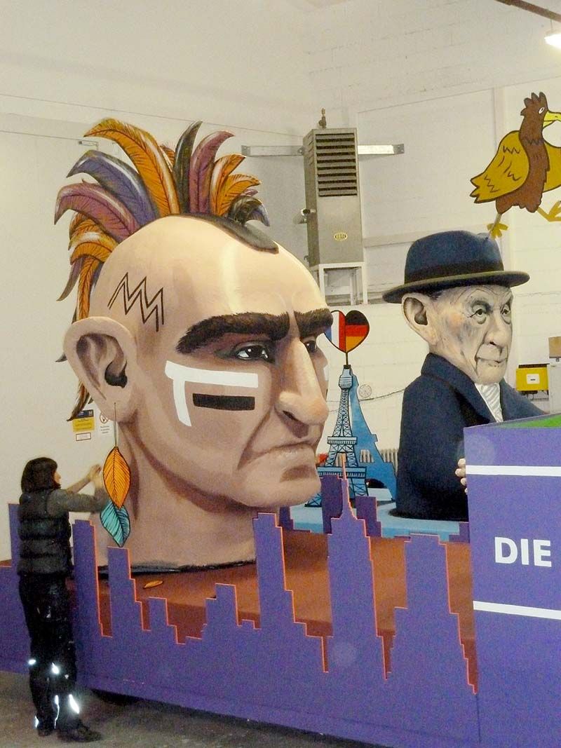 Das Jubiläum der 50. Wiederkehr des Datums der Unterzeichnung der Elysee-Verträge und die im gleichen Jahr (1963) vom damaligen französischen Staatspräsidenten Charles De Gaulle vor tausenden Menschen gehaltene Ansprache auf der Treppe des Alten Rathauses in Bonn war der historische Bezugspunkt für den Mottowagen „Deutsch – Französische Freundschaft“ . Neben dem Blick in die Vergangenheit weist ein weiterer Mottowagen in die Zukunft: nämlich auf die „Irokesen – Ausstellung“ , die am 23. März in der Kunst- und Ausstellungshalle eröffnet wird.