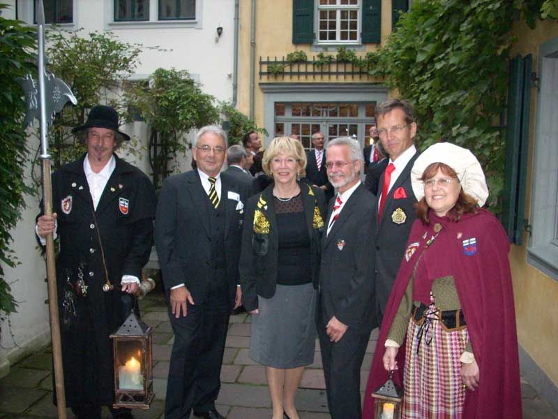 Marlies Stockhorst konnte vor dem Beethovenhaus die Abordnungen aus Aachen, Köln und Düsseldorf unter der Leitung ihrer Präsidenten begrüßen. Auf dem Gruppenfoto sind von links zu sehen: Karl Friedrich Schleier, Wilm Lürken, Aachen, Marlies Stockhorst, Bonn, Joachim Wüst, Köln (Vizepräsident; Markus Ritterbach, Präsident, kam später dazu), Josef Hinkel, Düsseldorf, Elisabeth Schleier