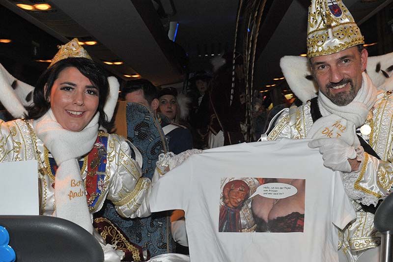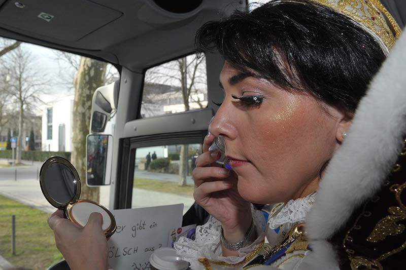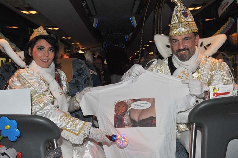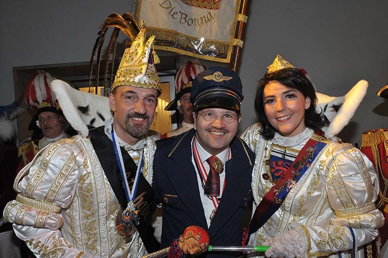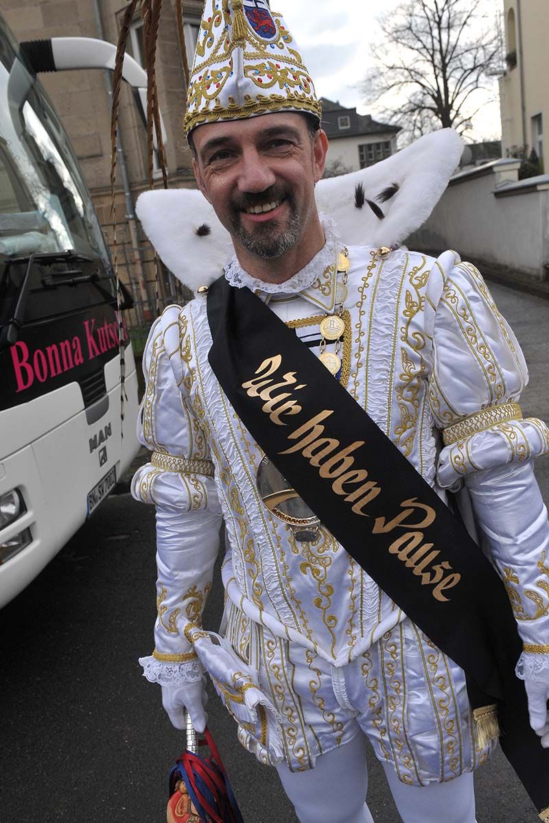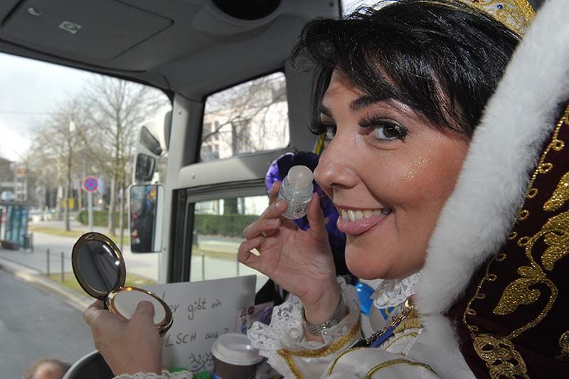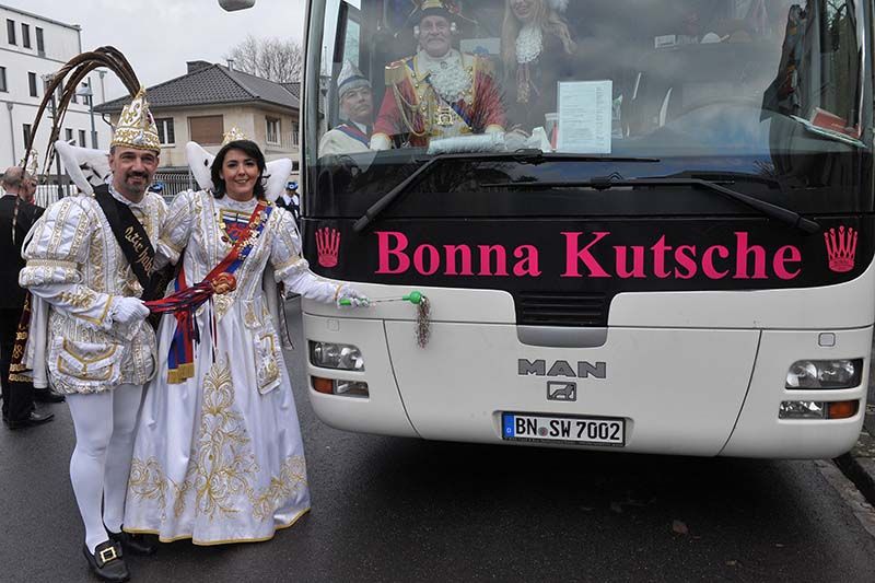 Das Prinzenpaar und seine Equipe hat an Weiberfastnacht ein dicht gestaffeltes Besuchsprogramm zu absolvieren: Von morgens um Neun bis Abends um Neun geht es zwölf Stunden Nonstop zu den Parties in Behörden und Unternehmen, darunter auch die Bonn ansässigen „Daxe“ Deutsche Telekom und Deutsche Post, zu Karnevalssitzungen in Schulen, Seniorenheimen und zum Kaffeeklatsch der Damenkomitees. Mit dabei eine große bunte Musikertruppe in Musketier-Kostümen, die sich aus Mitgliedern des Musikvereins Duisdorf und der Bornheimer Schützenkapelle rekrutieren. Die Stabführung an Weiberfastnacht hat stets Christoph von Heydebrand. Wenn der Tour-Bus voller Narren dann abends zur Hofburg zurückkehrt werden Prinz und Bonna Kontakt zu mehr 10.000 Jecken aus Bonn und der Region gehabt haben.