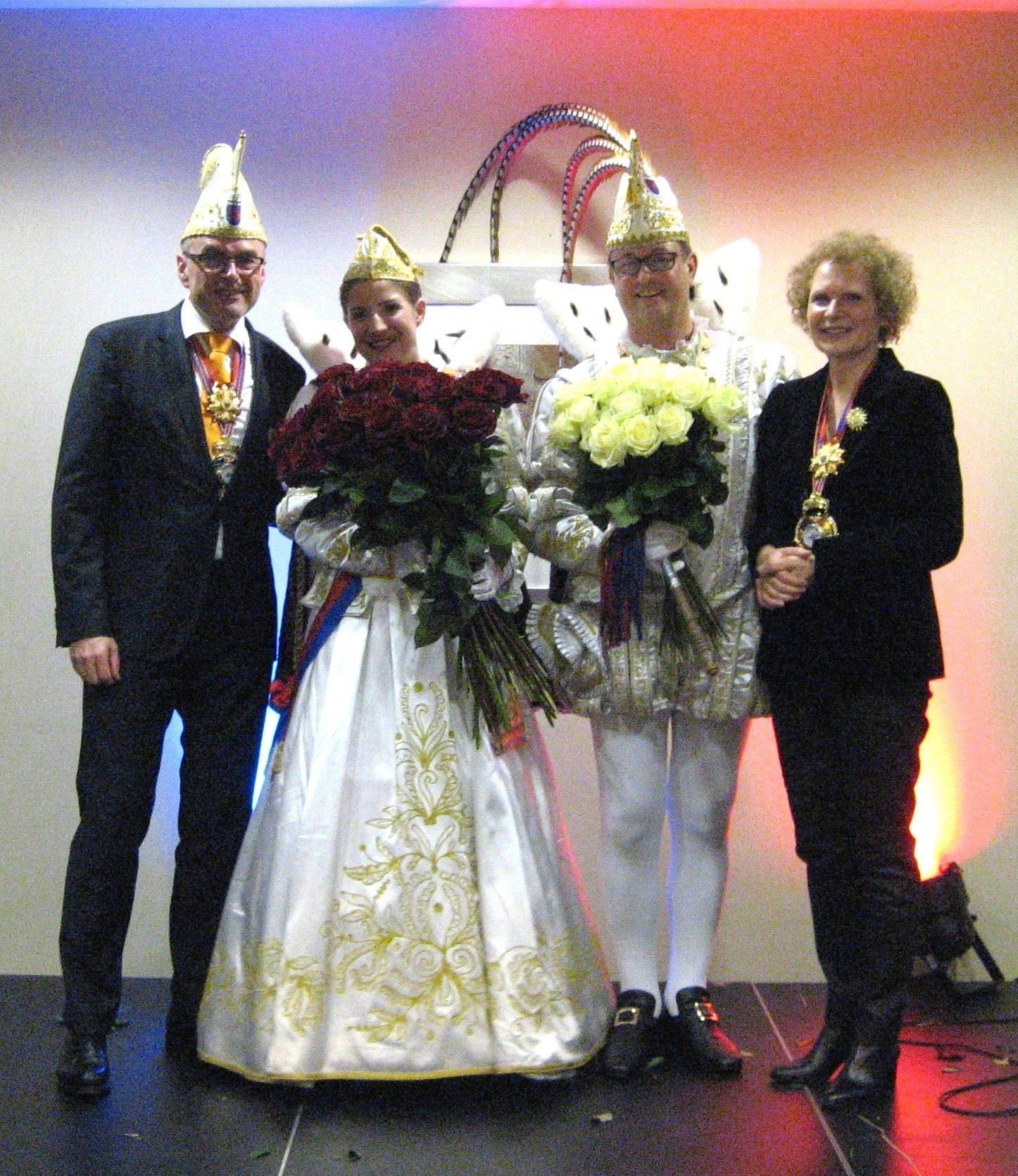 Völlig überrascht war Prinz Michael als seine Chefin Ines Knauber-Daubenbüchel die Bühne betrat. Die Unternehmerin hatte extra ein Führungskräftetreffen der Knauber-Unternehmensgruppe unterbrochen, um ihrem Abteilungsleiter zu gratulieren. Mit sehr persönlichen Worten und einem dicken Strauß weißer Rosen dankte sie dem Prinzen für sein Engagement im Betrieb und im Fastelovend. Der so Gelobte musste sich erstmal sammeln und deshalb durfte -ganz entgegen dem strengen Protokoll- zunächst Bonna Tiffany zu den Gästen sprechen. Sie brachte die Gefühle der Tollitäten auf den Punkt: „Die Überraschung kann hinter jeder Tür lauern!“ sagte die Bonna und zielte damit auf die vielen unerwarteten Momente und Begebenheiten während der Session ab. Prinz Michael dankte dann zunächst seiner Chefin für ihr Verständnis und die Unterstützung, die ihm als höchstem Repräsentanten im bönnschen Fastelovend zuteil wurde. Auch Hotelchef Christoph Glaser durfte sich über den Dank „für die großartige Gastfreundschaft“ im Hotel Hilton aus dem Mund des Prinzen freuen.