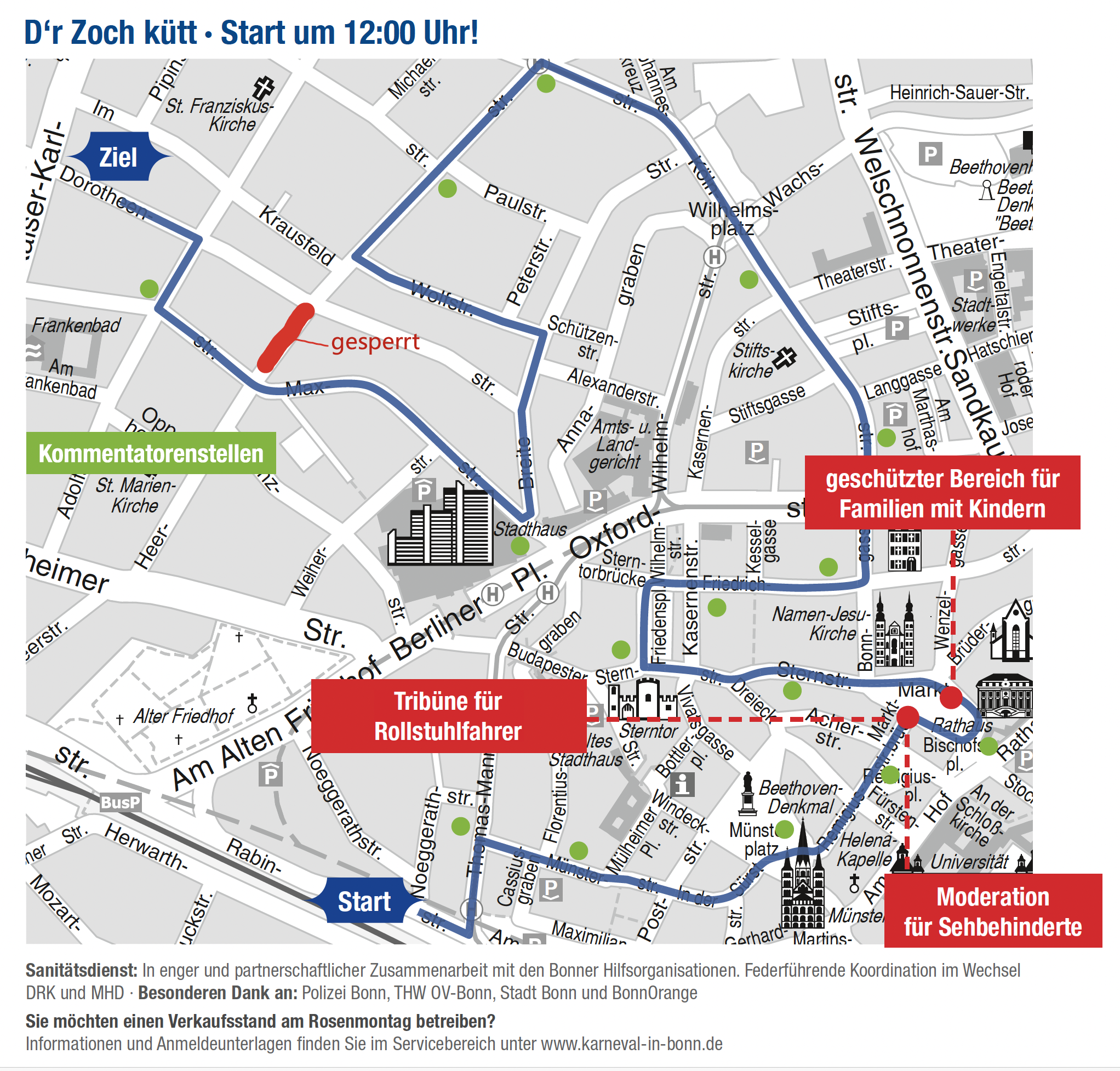 Jeder Rosenmontagszug folgt einem bestimmten Weg und hat mehrere Kommentatorenstellen. An der sogenannten „Kindersammelstelle“ können Kinder, die ihre Begleiter verloren haben, abgegeben werden.